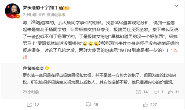 快科技4月5日动静,罗永浩今天正在社交平台谈及武大杨同窗相关事务的评论履历,婉言本人因客不雅阐发事务的分歧角度,先后被极端女权和极端男权群身形度频频改变看待,最终让两方极端都心生不满。正在谈及部门看似对杨同窗有益的概念时,敏捷获得极端女权群体的夸奖,却遭到极端男权群体的恶意。,极端女权群体纷纷“早就晓得男的没一个好工具”,极端男权群体则转而暗示承认:“罗哥我就晓得没看错你”。罗永浩也转发认同这一概念。此番言论也让不少网友暗示认同,正在各类热点事务的会商中,极端化的声音往往会客不雅的切磋。以至有些极端群体的辩论,素质上并非为了厘清事务,只是借着热点事务博取流量。