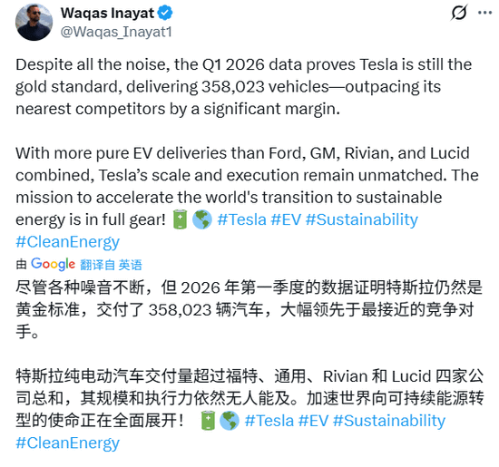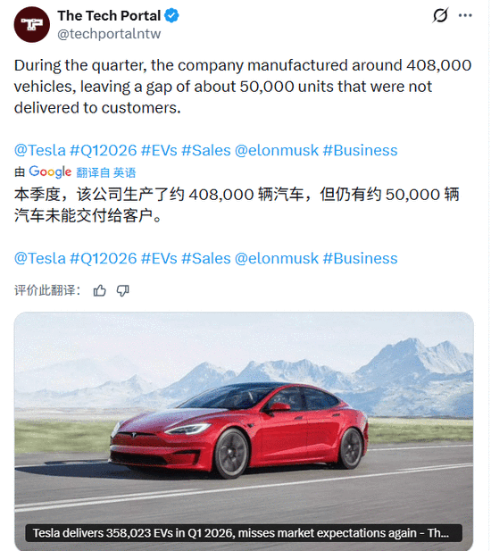 科技Teslarati则正在一篇名为《特斯拉第一季度交付数据显示马斯克是准确的》的报道中给出了分歧的视角。文章认为,疲软的数据恰好印证了马斯克此前的计谋预判:保守电动车营业对特斯拉全体估值的焦点驱动感化正正在边缘化。