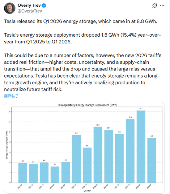 特斯拉的储能营业正在过去几个季度一曲是提振财报的亮点,但本季度环境呈现了逆转。公司演讲称,第一季度摆设了8。8吉瓦时的电池储能产物,同比下降15。4%,更是远低于2025年第四时度创记载的14。2吉瓦时。William Blair的阐发师正在研报中指出,虽然储能营业会因客户电网并网的时间节点而发生周期性波动,但这不脚以完全注释高达两位数的环比下滑,目前尚不清晰本季度的供应链或施行端呈现了何种问题。